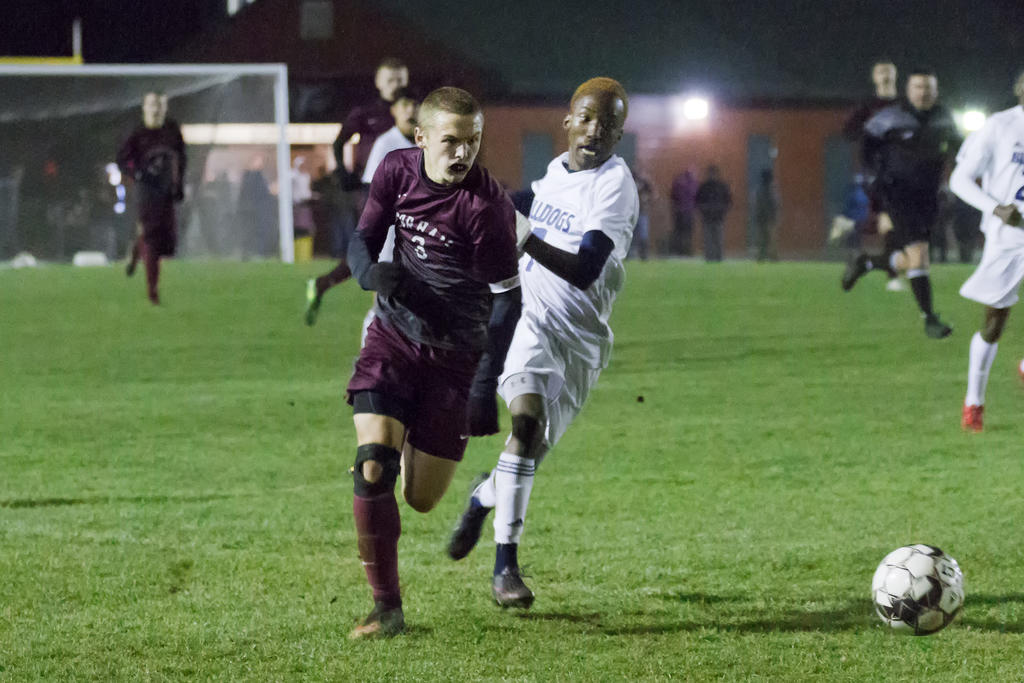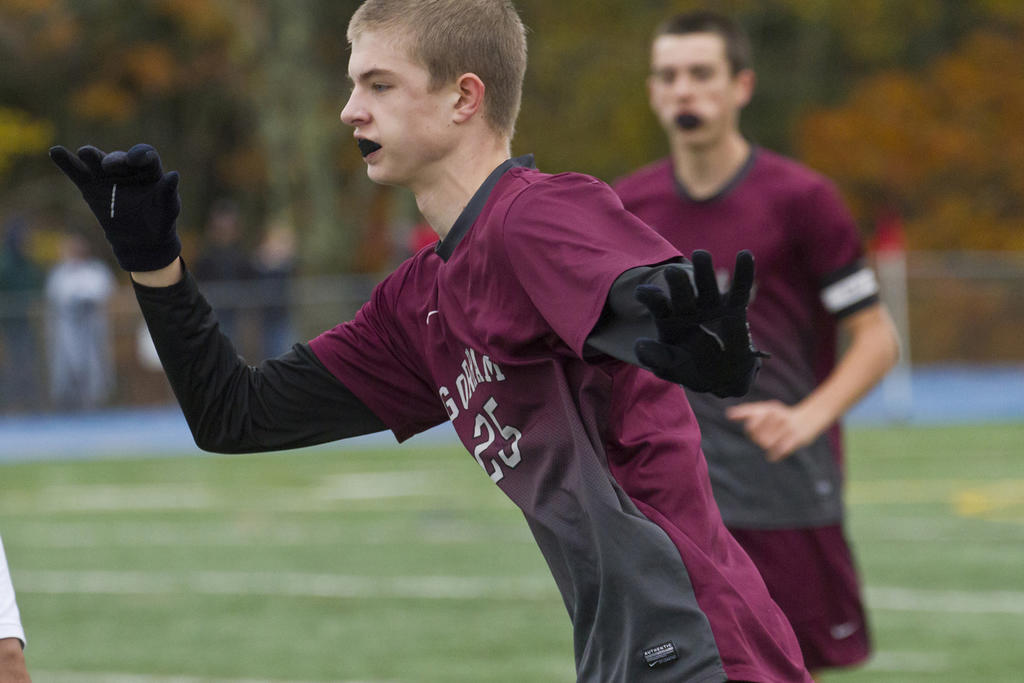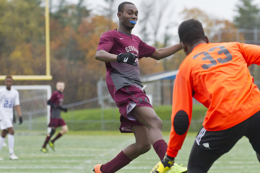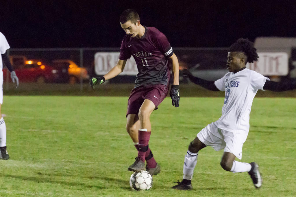 Portland began the game applying pressure, but Gorham’s standout defense – relatively inexperienced – held the Bulldogs at bay, with ace netminder Trevor Gray making every play he was called upon to make. In the seventh minute, for example, Gray turned in a leaping, one-handed deflection on a hard Portland shot from outside-left; the ball sailed high and right of the goal.