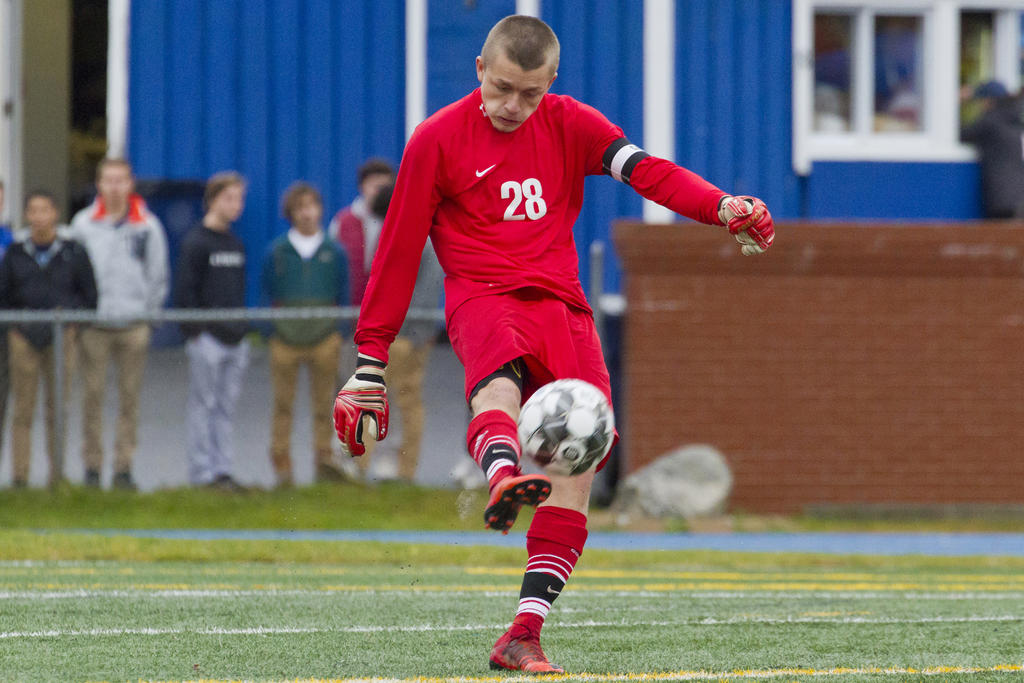 Trevor Gray boots a goal-kick away.