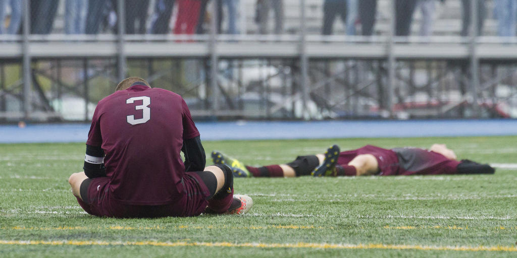 A disconsolate Andrew Rent sits, slumped and defeated, on the field following the Rams loss to the Devils in Saturday’s State Final.