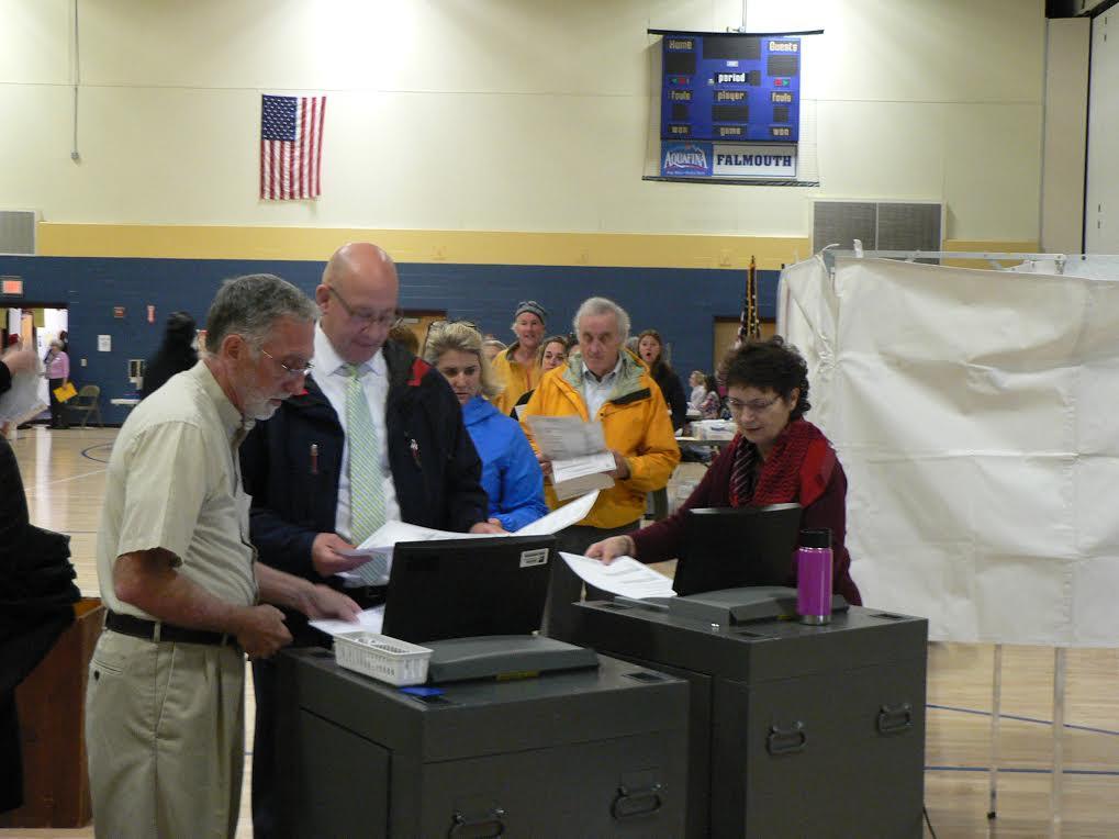 Falmouth Town Clerk Ellen Planer said the town saw huge voter turnout in Tuesday’s elections. Voters were lined up outside before 7 a.m. and all day a steady stream of voters filled the voting booths.