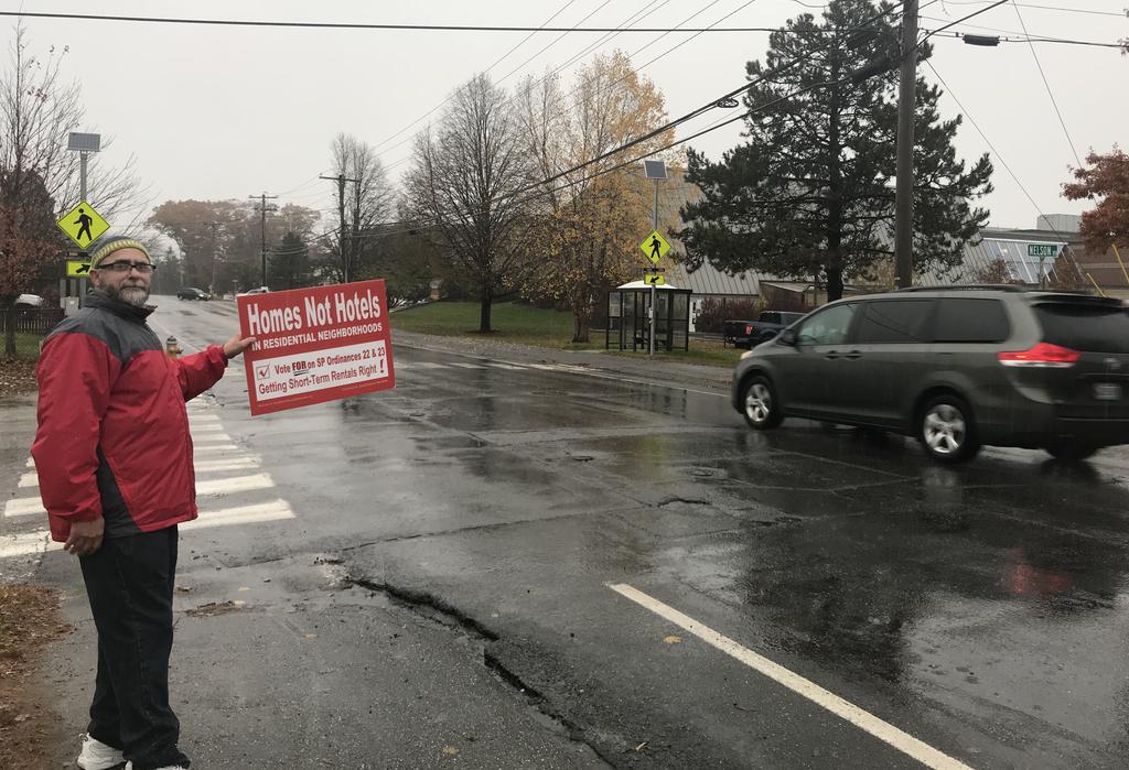 Dan Romano outside the South Portland Community Center on Election Day on behalf of Neighbors for Neighborhoods, encouraging residents to vote for ordinance amendments that will ban unhosted short-term rentals in the city’s residential zones.