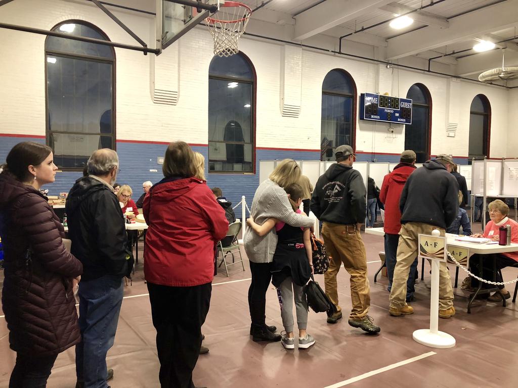 There’s time for a hug during a wait to vote in Gray Tuesday.