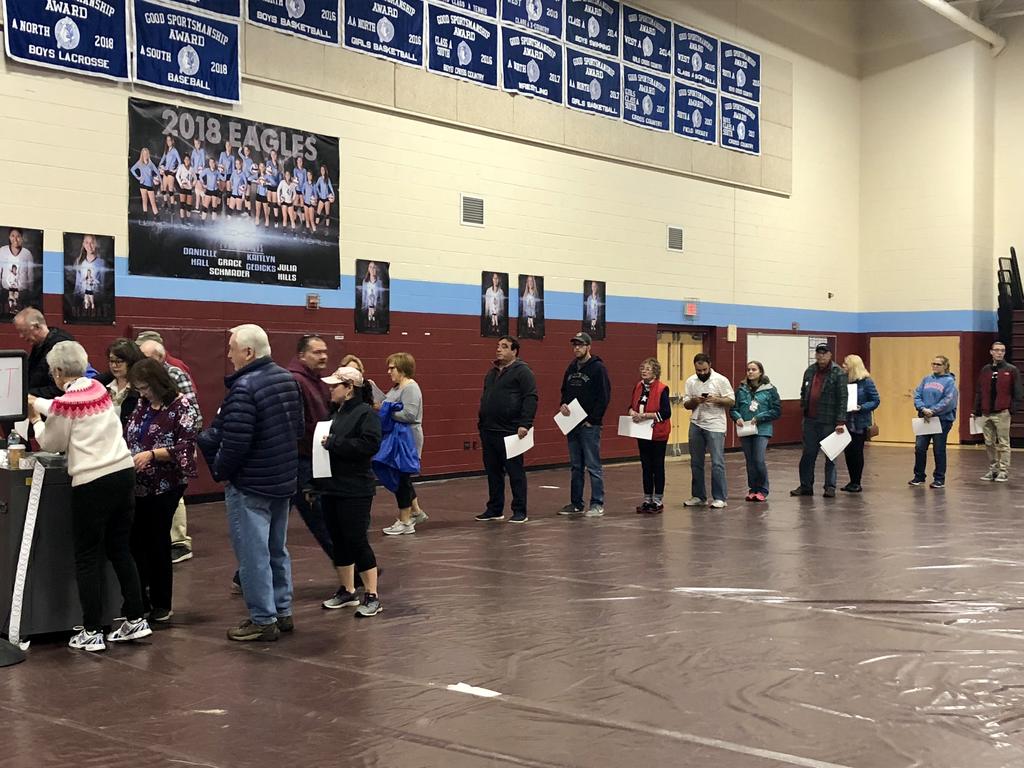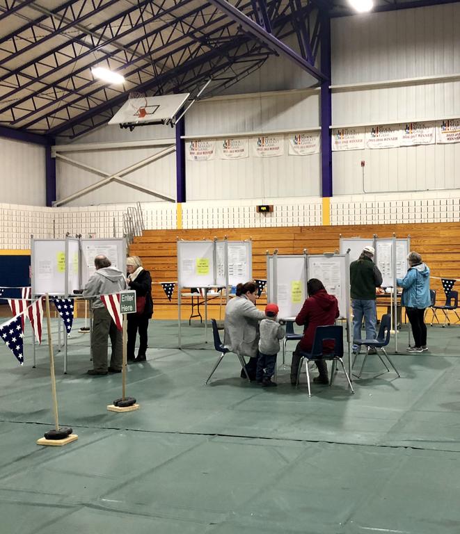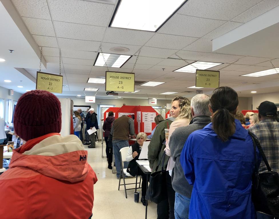 Voters line up to turn in their ballots Tuesday at Windham High School.