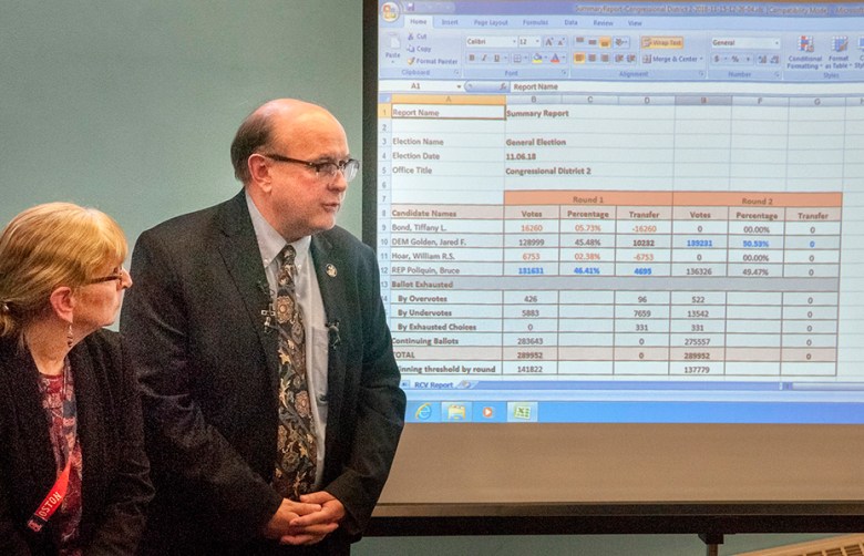 That triggered Thursday’s ranked-choice runoff, which came after staffers in Secretary of State Matt Dunlap’s office spent several days scanning and downloading all of the nearly 290,000 ballots cast Nov. 6 in the 2nd District. The runoff only took a few minutes to complete as specialized computer software eliminated Hoar and Bond from the equation and redistributed their supporters’ votes to the candidates – either Poliquin or Golden – who they had ranked highest.