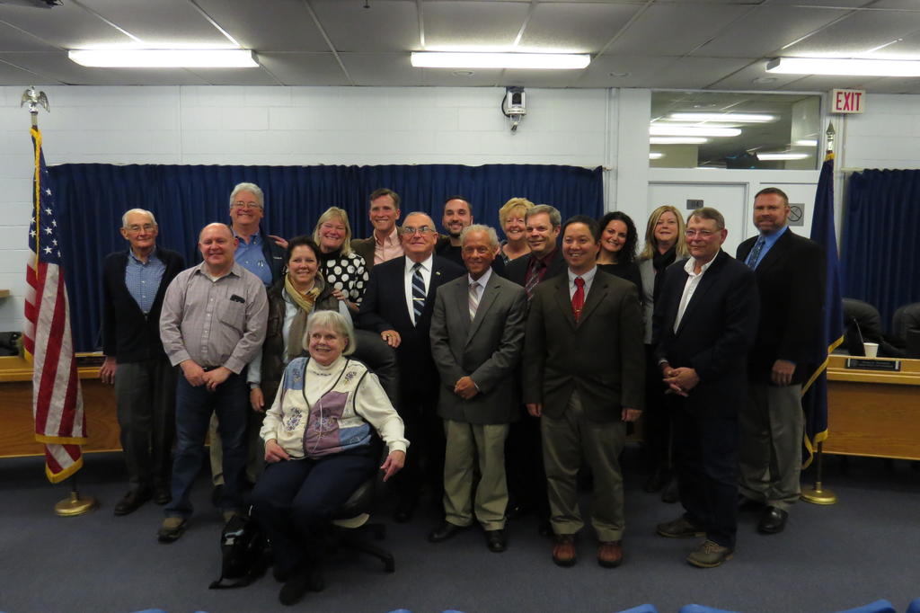 John O’Hara poses Monday night with many of the elected officials he has worked with during his 20-year tenure on the City Council. Much of the meeting was spent paying tribute to O’Hara.
