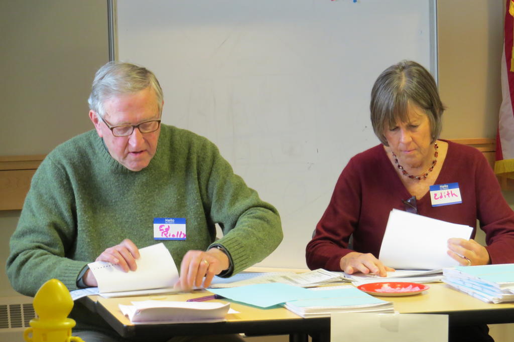 Counters chosen by Ward 5 School Committee candidates Beth Schultz and Jim Violette look over ballots that were filed in person on Election Day during a recount effort initiated by Violette.