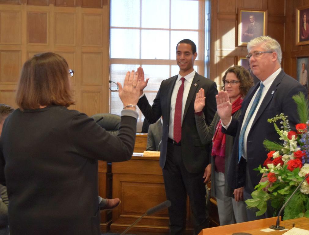 Portland City Clerk Kathy Jones administers the oath of office Monday, Dec. 3, at City Hall to returning City Councilors Spencer Thibodeau, Belinda Ray and Nick Mavodones. Thibodeau and Ray were elected to second terms Nov. 6; Mavodones won his eighth term. In welcoming the council to a new session, Mayor Ethan Strimling noted it was only the second time in nine years that the board’s composition remained unchanged after an election. (David Harry / The Forecaster)
