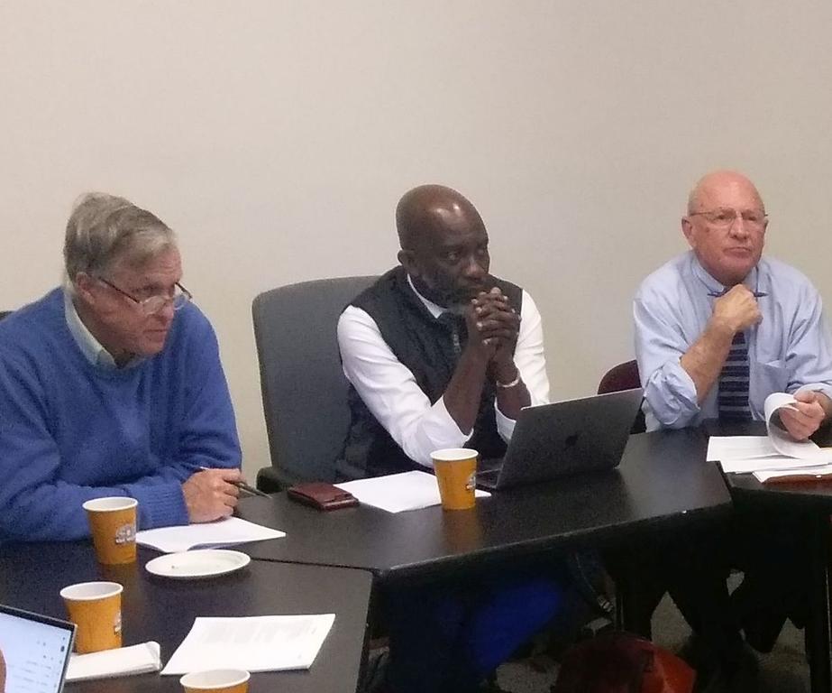 Portland City Councilor Pious Ali, center, leads a legislative strategy session in City Hall on Dec. 13, flanked by Democratic state Reps. Erik Jorgensen, left, and Michael Brennan.