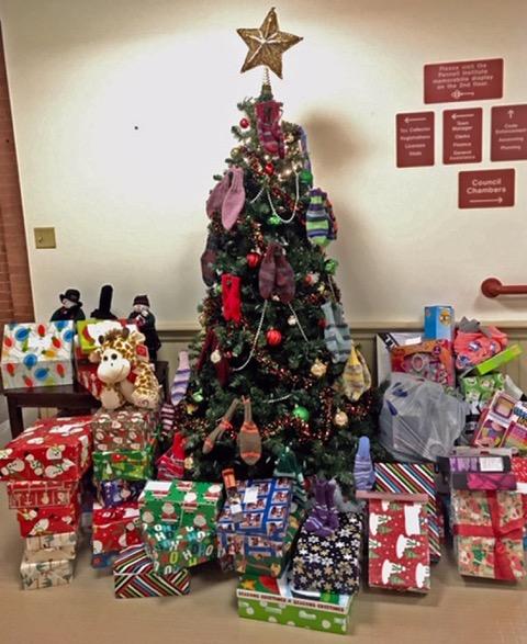 The gifts piled up this month at Town Hall for the Shoe Box Giving Program.