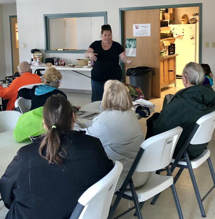 Amy Fitzgerald chats with clients at the Standish Food Pantry on Monday.