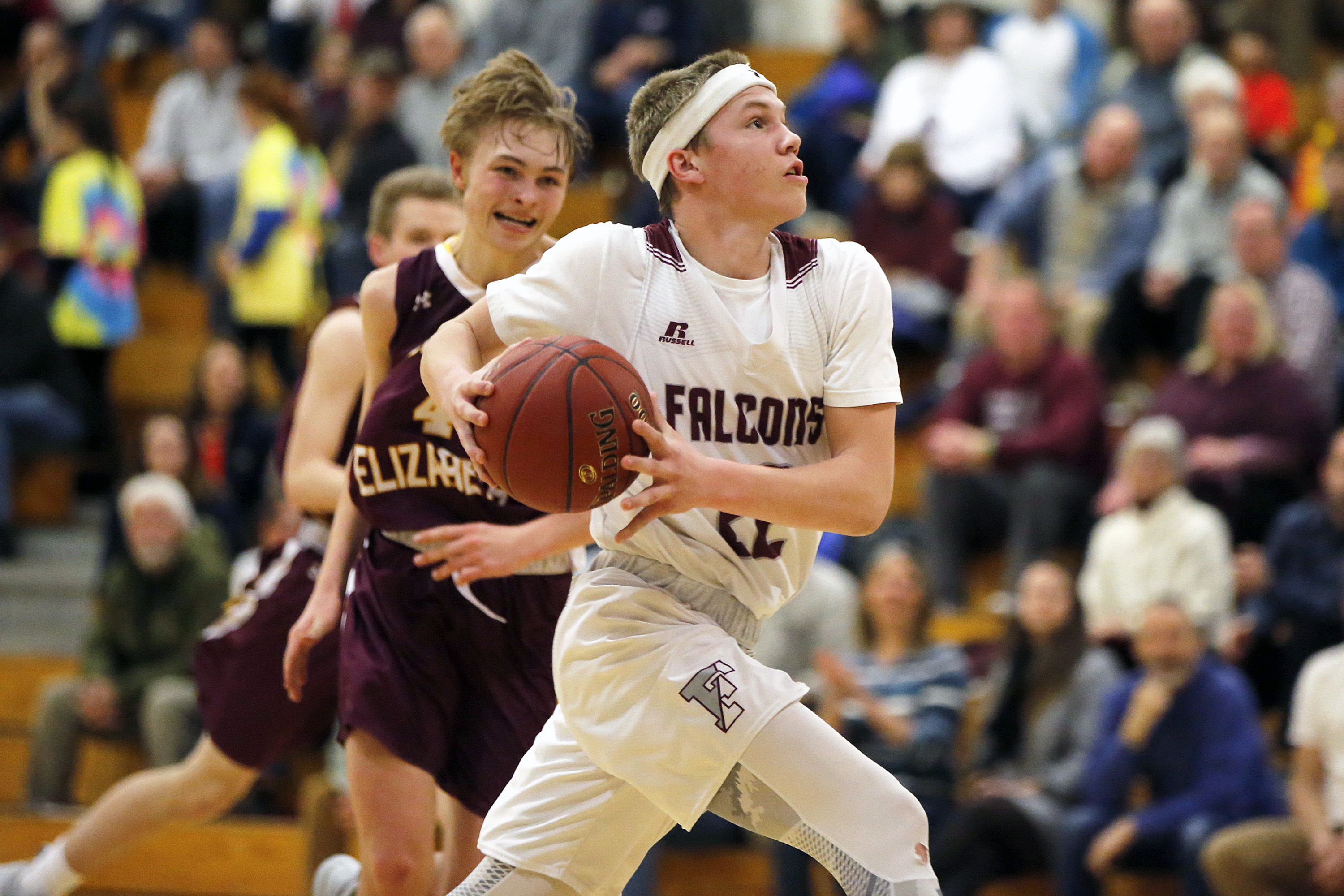 Freeport’s Gabe Wagner goes up for a shot while being pursued by Cape Elizabeth’s Quinn Morse.
