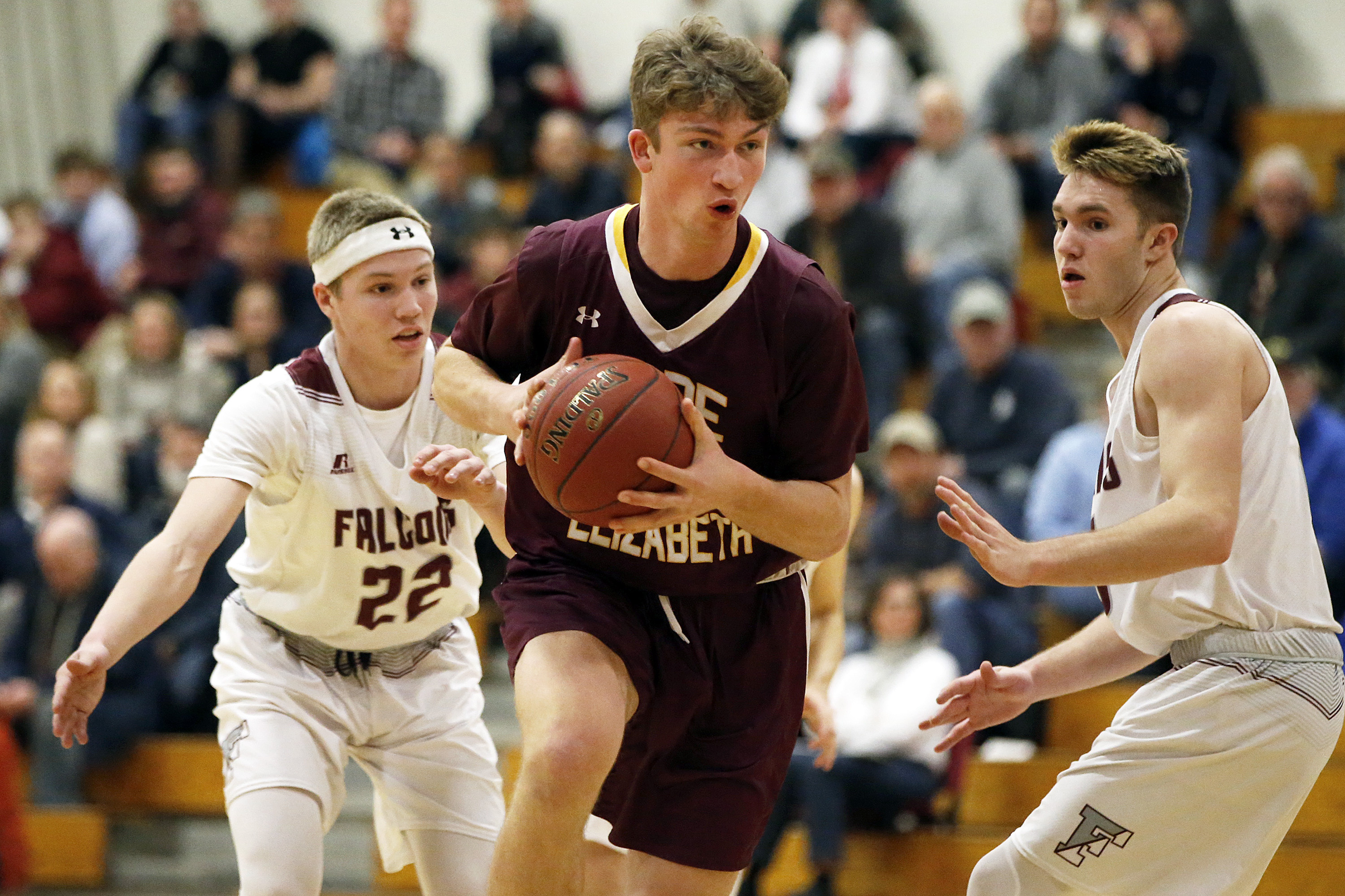 Cape Elizabeth’s Andrew Hartell finds some space between Freeport’s Gabe Wagner, left, and Shea Wagner.
