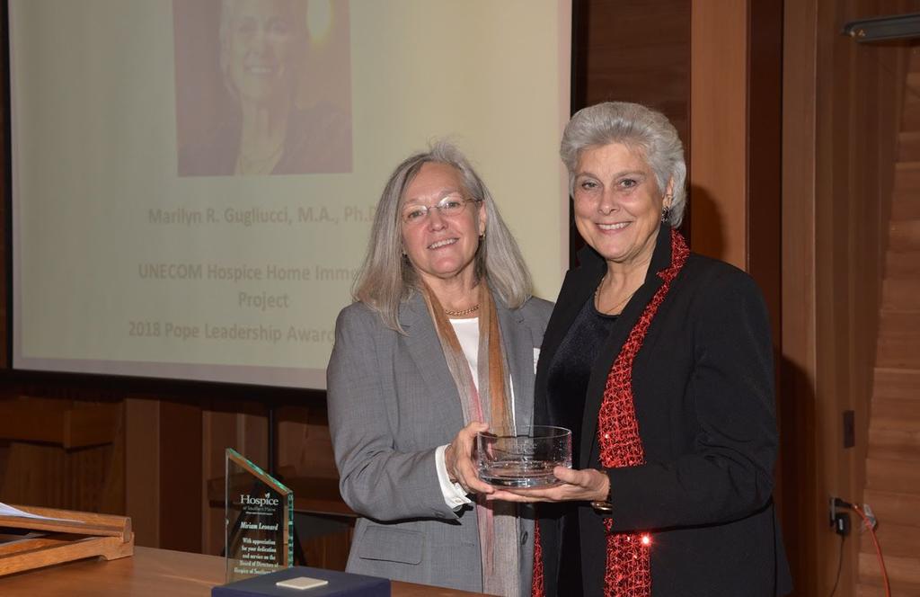 Hospice of Southern Maine honored Dr. Marilyn R. Gugliucci, right, director of Geriatrics Education at the University of New England, with the Pope Leadership Award at its annual meeting in December at Congregation Bet Ha’am in South Portland. The award recognizes a person or organization for visionary leadership, commitment to advancing the work of hospice, and to supporting the mission of Hospice of Southern Maine.