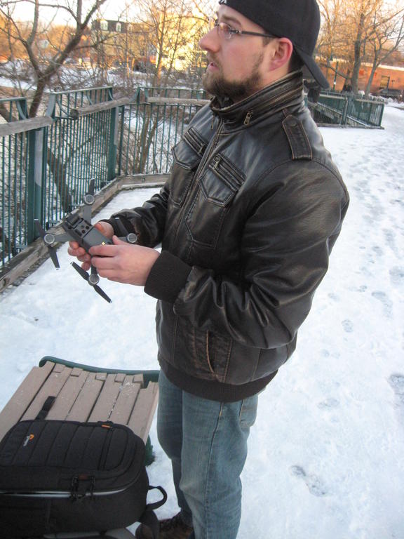 Michael Lahr of Westbrook prepares to launch a drone Tuesday to catch a bird’s eye view of the ice disk.