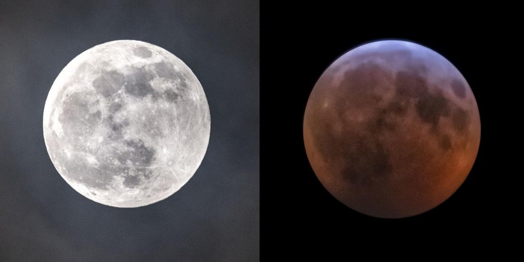 The clouds from Sunday’s snow storm parted long enough to offer a view of the super blood wolf moon over Maine. The eclipse, with the moon, Earth and sun aligned, lasted several hours, and turned the moon “blood” red from refracted sunlight. January’s full moon is traditionally called a “wolf” moon, and it was “super” this year because of how close the moon is to the Earth. In these photos from Falmouth, the super wolf moon is seen around 9:30 p.m., Jan. 20, left, with the super blood wolf moon just after midnight Monday morning. (Dudley Warner / For The Forecaster)