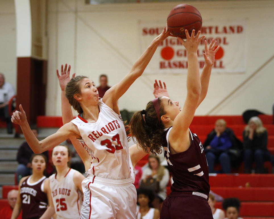 South Portland junior Maggie Whitmore shoots over Edward Little junior Chantel Ouellette. Whitmore had a game-high 20 points.