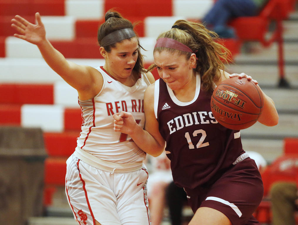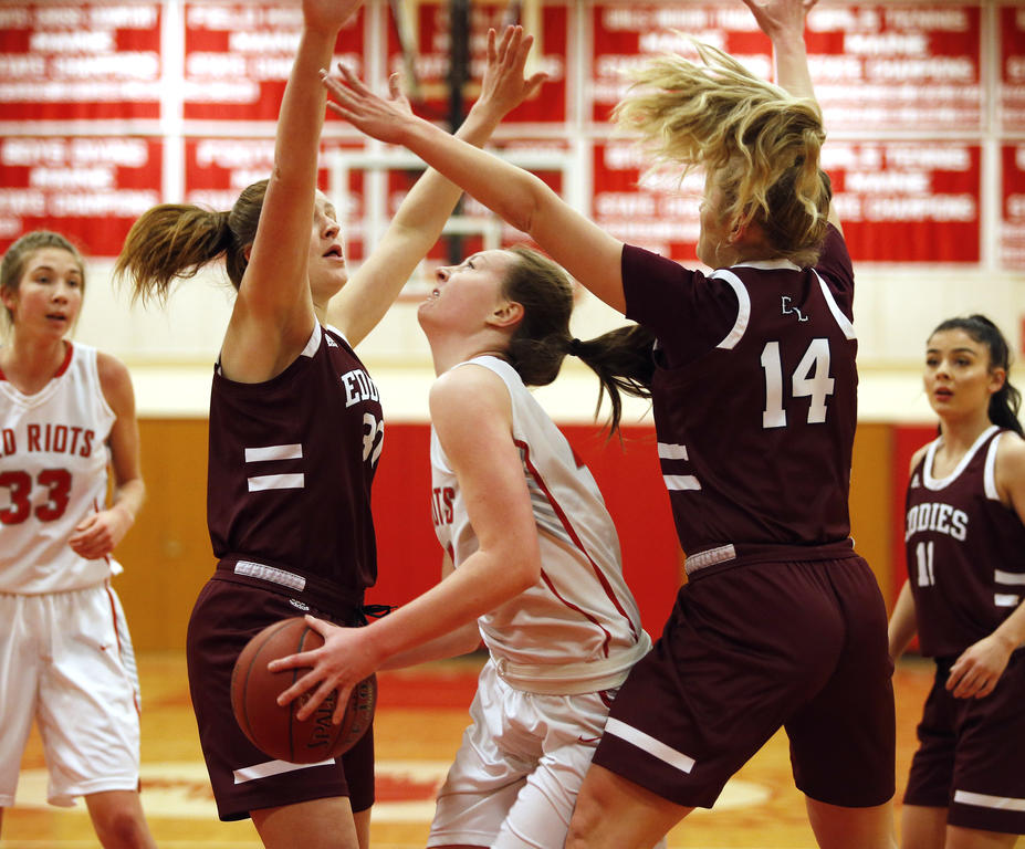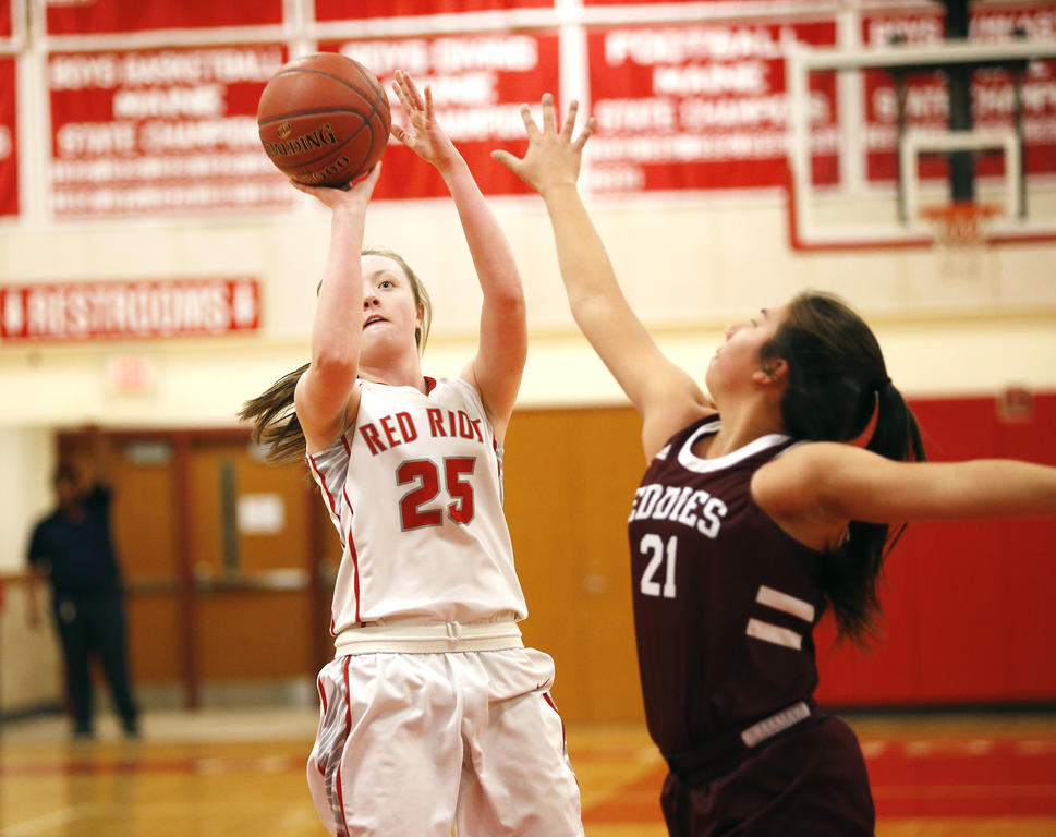 The Red Eddies hung tough in the third period, tying the score at 18-18 and 21-21, but a 3-pointer from senior Bela Cloutier gave South Portland the lead for good and junior Maggie Whitmore sparked a 6-0 run to start the final stanza to put the Red Riots up, 34-26.