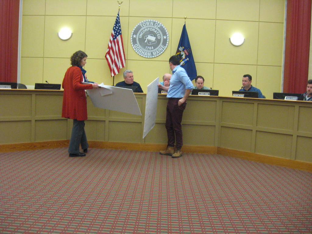 Sashie Misner of Gawron Turgeon Architects and Nate Howes, representing Avesta Housing Development Corp., Monday show the Gorham Planning Board details of a proposed expansion at Ridgewood I, a senior citizens housing project off School Street.