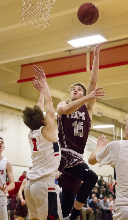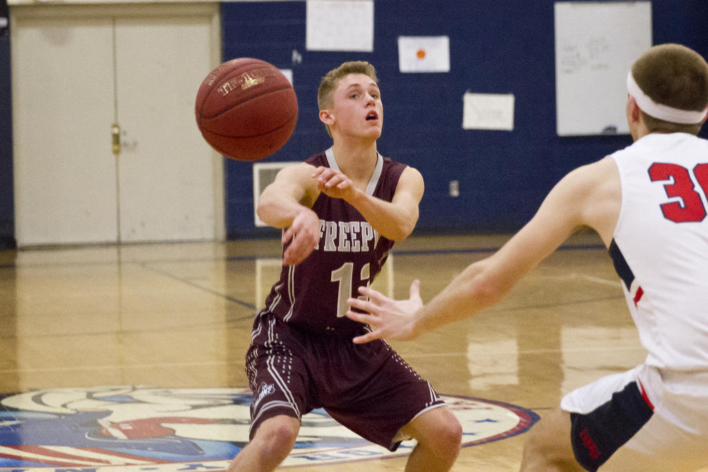 GRAY–Despite leading by a big chunk partway through the first half – and even leading by a few at the break – the Patriots couldn’t hold on against a determined Freeport squad on Thursday night, Feb. 7. The Falcons surged in the third on big Toby Holt and Gabe Wagner contributions to ultimately prevail 63-52.