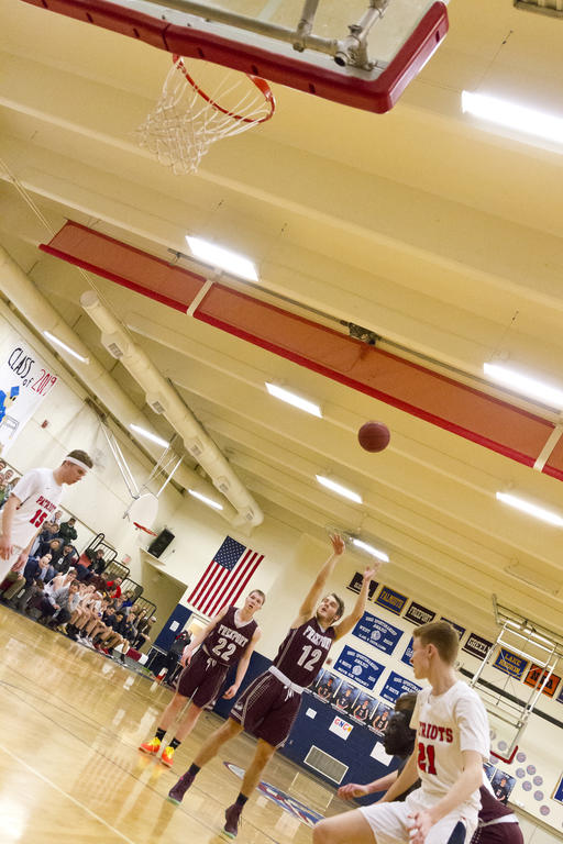 The sides continued to tussle as the opening eight minutes elapsed: Edwards and Martin added threes for the Patriots as they managed to mostly stay ahead of Freeport, for whom Gabe Wagner hit a three and Toby Holt hit a trio of twos. Pelletier, Colby and Matt Johnson kept up G-NG’s strong work snatching rebounds and the team closed the stretch on a high note: Martin began a drive up the lane, but finding himself thwarted midway, halted and shoveled the ball way out to one side, where Pelletier collected it and lofted it up for a successful three.