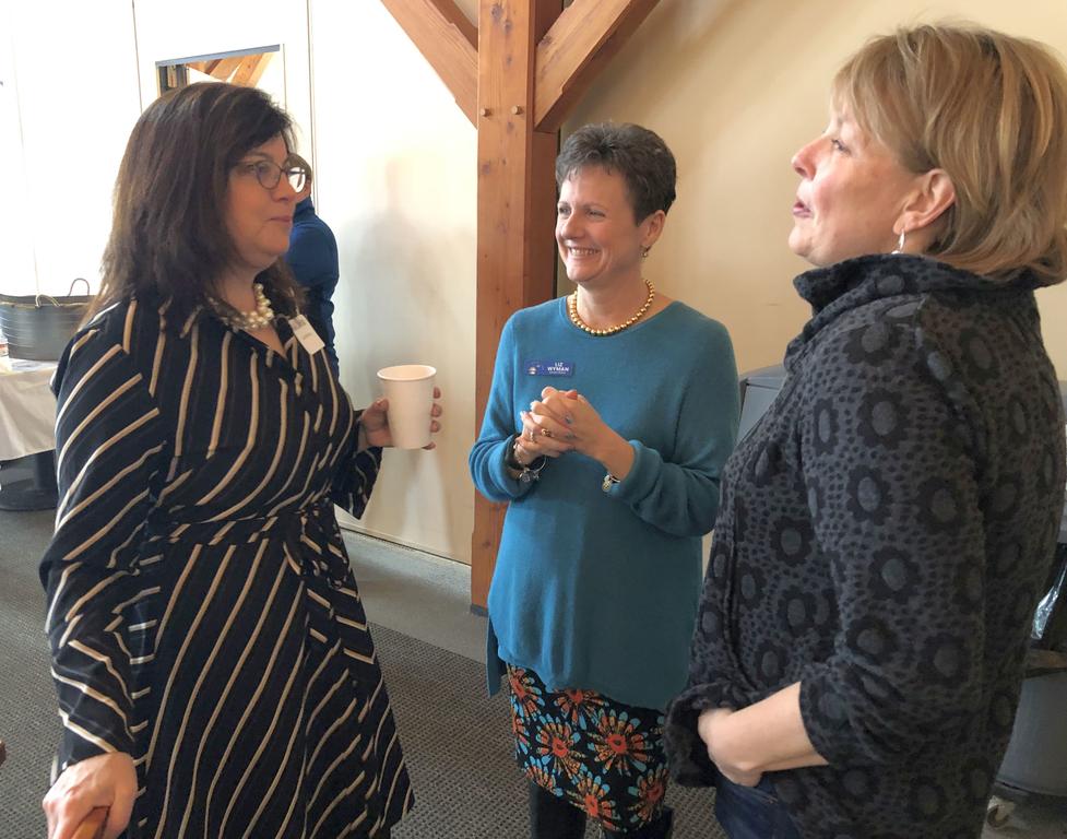 MaineToday Media Chief Executive Lisa DeSisto, left, chats with Liz Wyman of the Plant Memorial Home assisted living facility, and Lucy Boenitz of Pamela’s World jewelry store, Wednesday, Feb. 27, at a launch party for The Forecaster Coastal Journal Edition at Maine Maritime Museum in Bath.