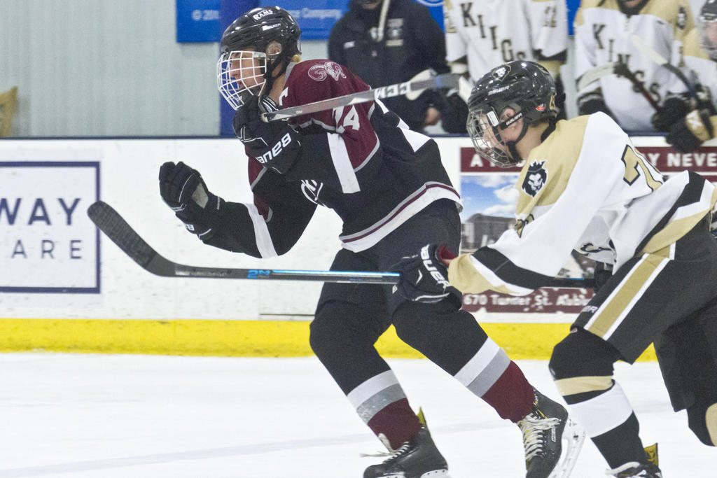 AUBURN—Early in the second period on Tuesday night, Feb. 26, the Rams put up three goals vs. the Kings, all inside a five-minute powerplay: Tanner Garand, Aiden Owens and Aiden Enck each capitalized once for Gorham in the stretch, after which the game seemed – well, no sure thing, but leaning one way. The Kings fought hard for the rest of the contest, but couldn’t stage a comeback: 4-2 Rams in the end.