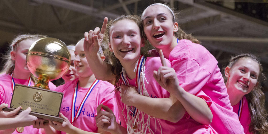 Gray-New Gloucester High School star Bri Jordan, right, hugs fellow G-NG star Jordan Grant after the Patriots’ victory over Mount Desert Island in the Class B state girls basketball championship. Story, page 11.