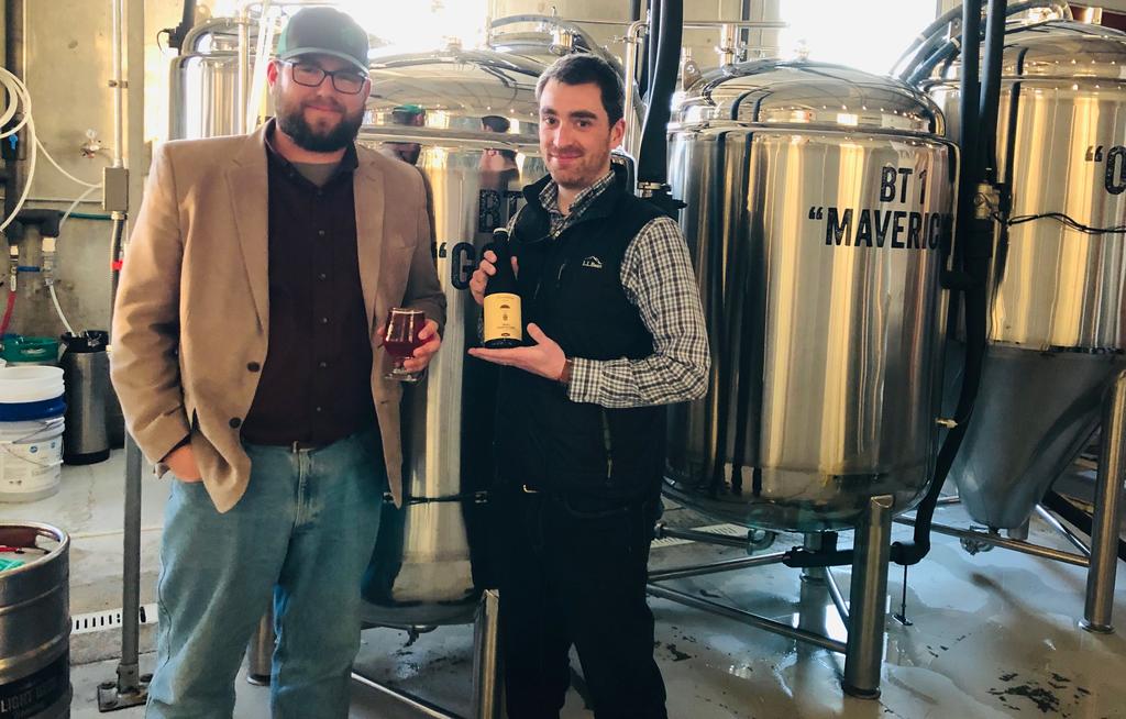 Nick Favreau, left, director of Woodside Hop House in Brunswick, with Flight Deck Brewing co-founder Nate Wildes at the 11 Atlantic Ave. brewery at Brunswick Landing.