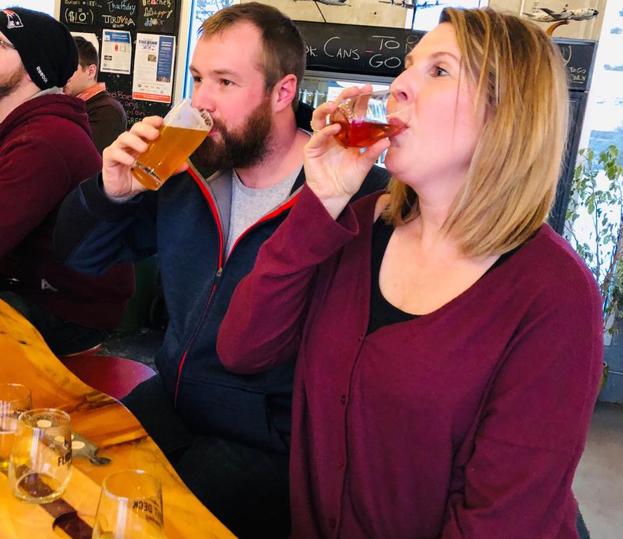 Ashley and Brett Doyan said they enjoyed the wine-like taste of Flight Deck Brewing’s newest offering, a blueberry lager with hops from Woodside Hop House in Brunswick.