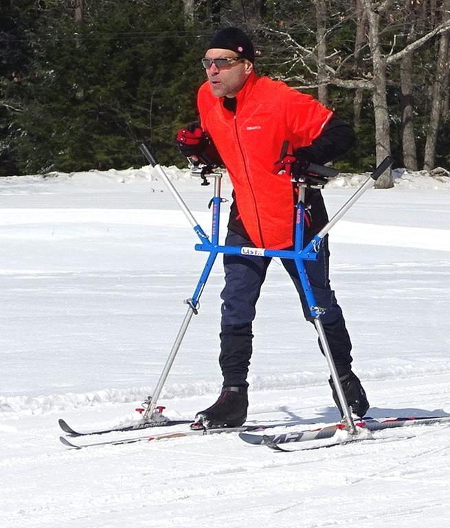 Frank Matzke of St. Augustine, Florida, uses adaptive ski equipment to compete in the VAST Fifth Annual Nordic Biathlon Camp at Pineland Farms on March 3.