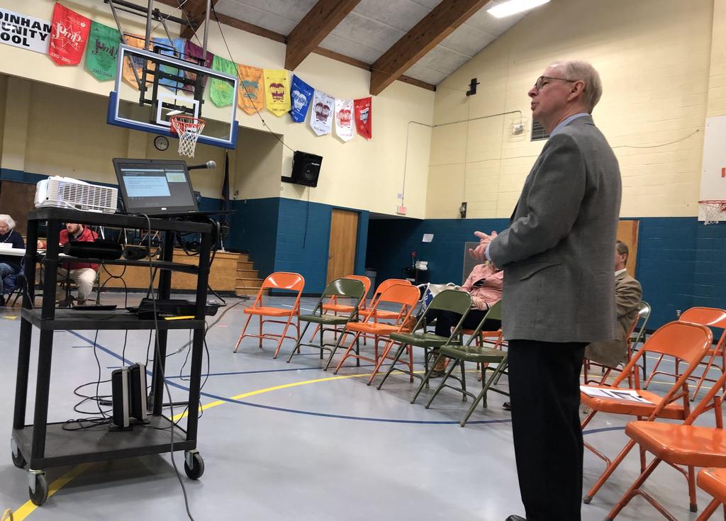 Mark Conrad, School Administrative District 75’s business manager, presents next year’s proposed budget to a sparse audience Tuesday at Bowdoinham Community School.