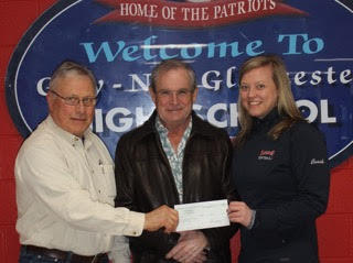 Gray-New Gloucester varsity baseball coach Brad Smith and varsity softball coach Amanda Harmon accept a Presenting Sponsor check from Dick McCann, center, president of McCann Fabrication, for the upcoming GNG Baseball/Softball Golf Tournament.