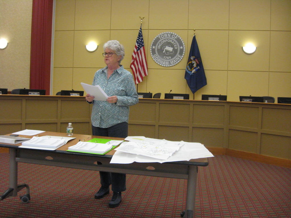 Brenda Caldwell, retired town clerk and a former Town Council chairwoman, presents histories of town cemeteries at the Gorham Historical Society meeting Monday.