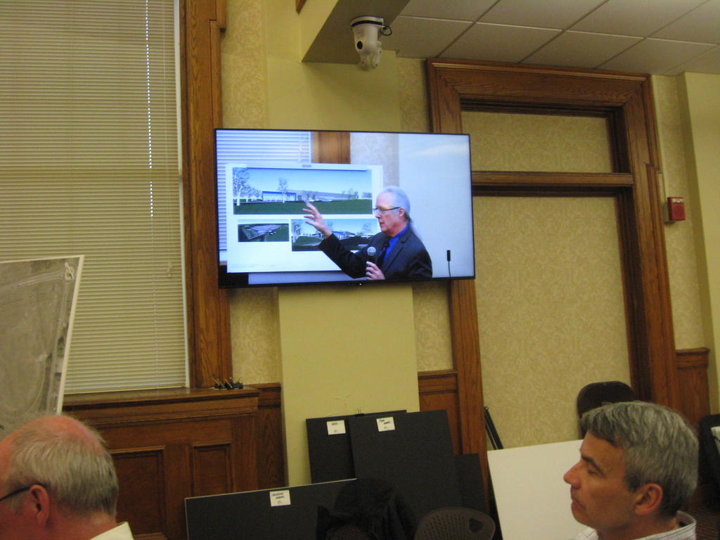 Architect Dana Watts of SMAA in Cambridge, Massachusetts, seen here on a TV monitor, shows some early renderings Monday of a new manufacturing plant proposed in Gorham by Harvey Performance Company.