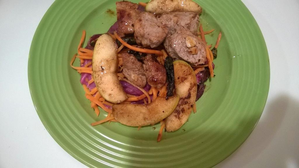 Pork with Fruit served atop Braised Red Cabbage Rounds.