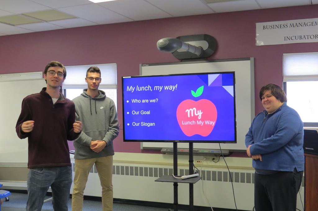 Sebastian Johns, Alek Opacic and Sebastian Johns practice their business pitch a week and a half before winning a contest in front of local business professionals May 13.