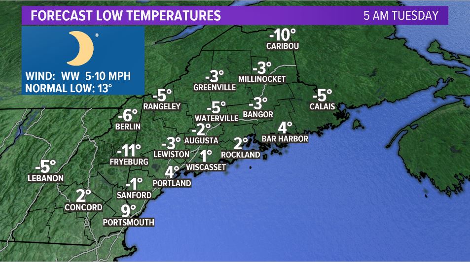 Monday night into Tuesday morning brings our coldest air of the season. Widespread temperatures below zero are expected inland early Tuesday morning. Some coastal areas try to stay in the low single digits, but it would not be much of a surprise to see a handful of spots below zero even on the water.