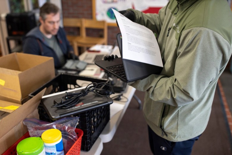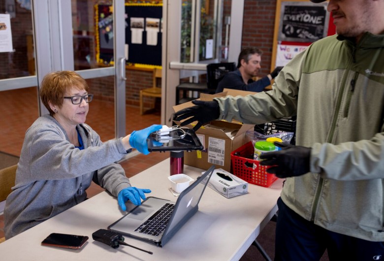 Staff at Portland’s Riverton Elementary School were set up in the main entrance of the school last week with stacks of laptops and newly ordered Wi-Fi hot spot devices to distribute to students.