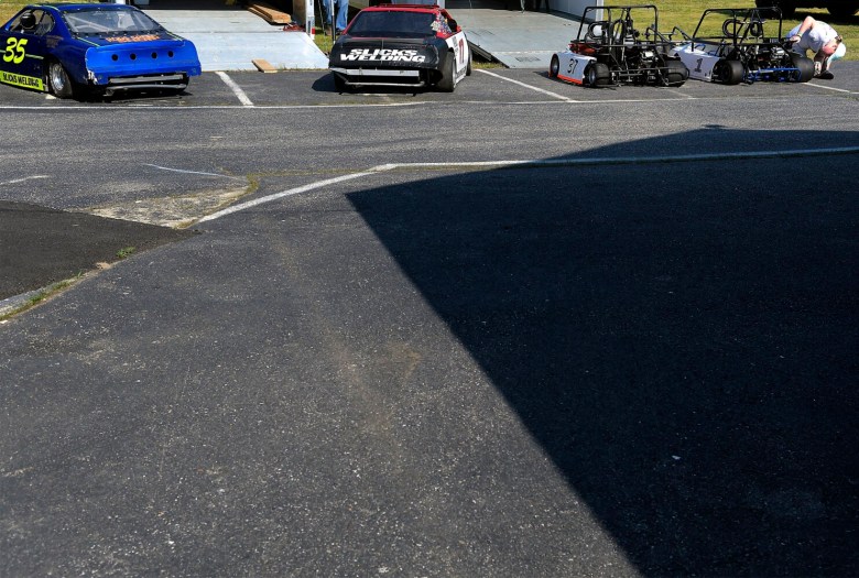 On Sunday, a modest crowd showed for the racing — most practicing social distancing. Some spectators isolated themselves on different parts of the bleachers that are scattered around the track. Makeshift garages are lined down the home stretch of the track and a food shack separated the track, tents and trailers.
