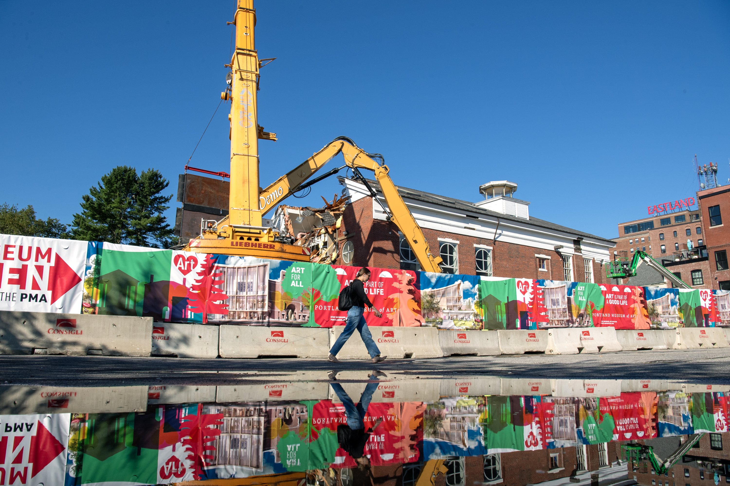 The demolition work being done at the former Children’s Museum and Theatre of Maine on Thursday is reflected in a water puddle in downtown Portland. (Daryn Slover/Staff Photographer)