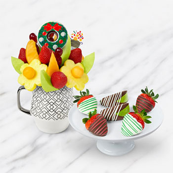 This festive bundle comes with a keepsake mug filled with fresh fruit wedges, including golden pineapple daisies and a beautifully decorated apple ring wreath along with a box of six pieces of chocolate dipped fruit: two chocolate dipped granny smith apple wedges, two chocolate dipped strawberries, and two white-chocolate dipped strawberries. A $64.97 value