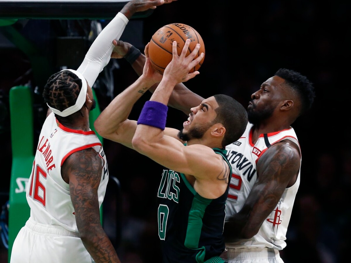 Jaylen Brown’s 3-pointer at the regulation buzzer extends the game, but James Harden makes two free throws late in overtime to give Houston a 111-110 win.