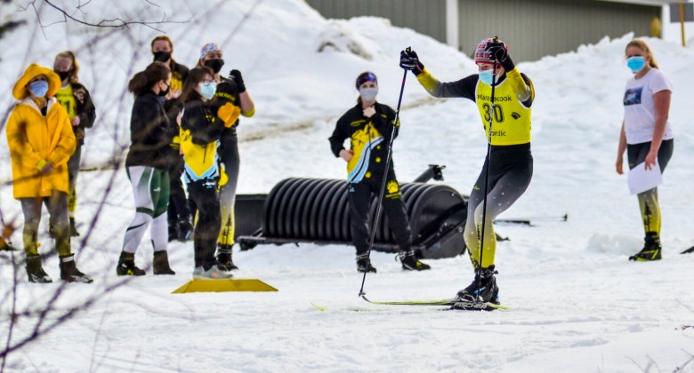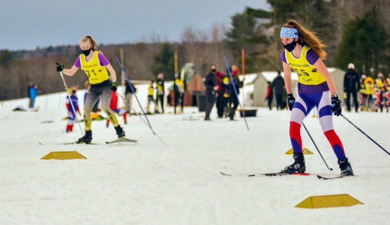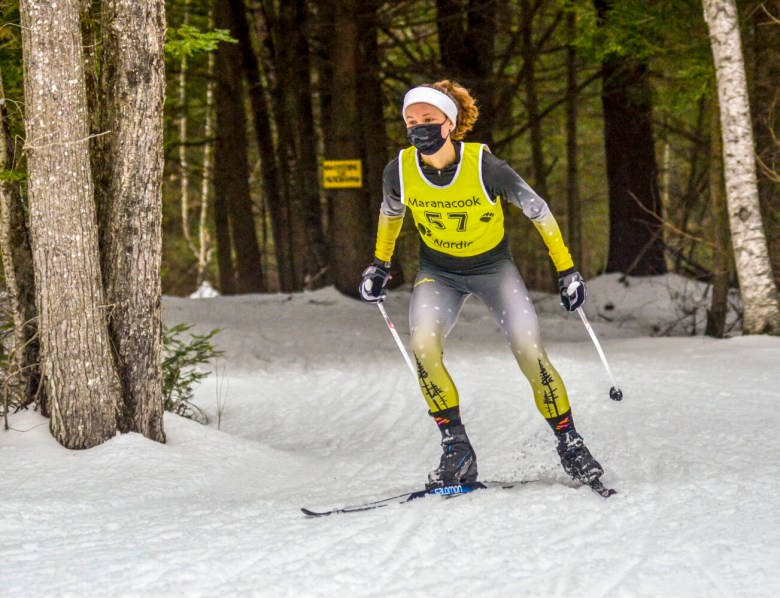 The venue added to what was an unusual day in an unusual year. Maranacook, which hosts meets each year but usually doesn’t have enough snow to hold them at home, this time got to have a race in its backyard. Temperatures reaching the mid-to upper-40s saw skiers in short sleeves in February. And, of course, there were the masks, a permanent reminder of the pandemic in which all of this was taking place.