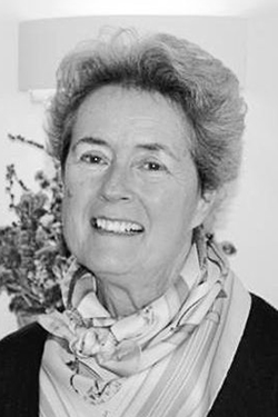 She is survived and deeply missed by her husband of nearly 55 years, Tim; her sons Michael and Tyler (both of London, UK) and Peter (Belmont, Mass.), stepson, Tony (Dallas); sister, Barbara and brother-in-law Robert Ward (Hingham, Mass.); daughters-in-law Junghwa Shin (originally of Seoul, Korea), Roberta Fabbri (originally of Milan, Italy) and Anca Bieru (originally of Braşov, Romania); nieces Stephanie Chiari (Braintree, Mass.), Kimberly Kozuch (Pleasanton, Calif.) and Ann Strout Jones (Cape Elizabeth), nephews Frank S. Strout, Andy Strout (both of Cape Elizabeth) and Tim Strout (Northport, N.Y.); and grandchildren Max, Alex, Giulia and Victoria Robinson (all of London, UK), David and Theo Robinson (Belmont, Mass.) and step-grandson, Jake Robinson (San Francisco).