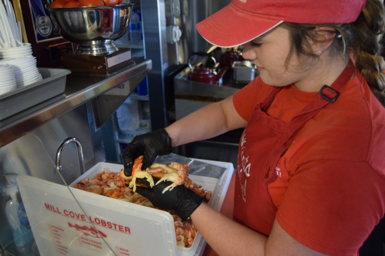 Creating the sandwich people will wait hours for begins when an Atlantic Edge Lobster delivery truck stops in front of the shack and offloads cases of Maine lobster meat sourced from the waters of Boothbay Harbor. The meat — only tails, knuckles and claws — arrives de-shelled and de-veined.
