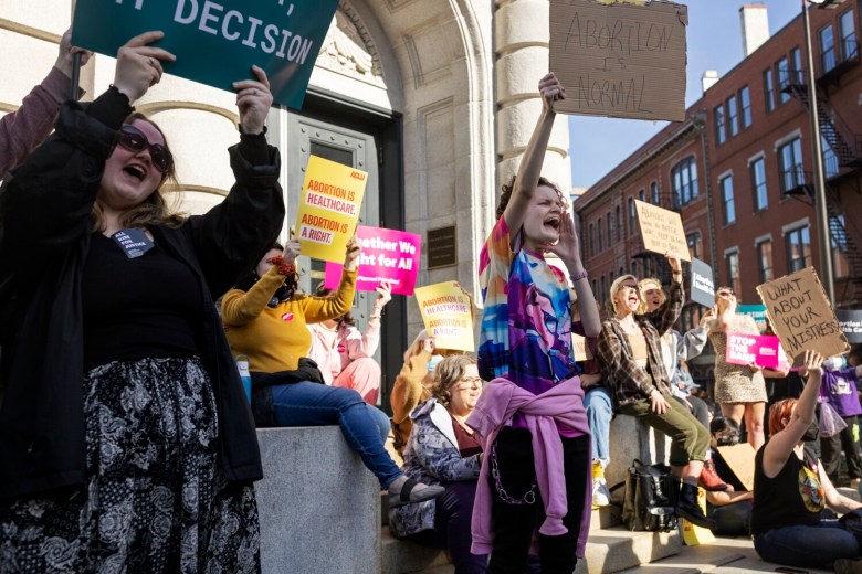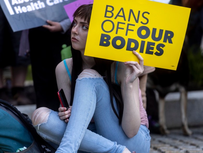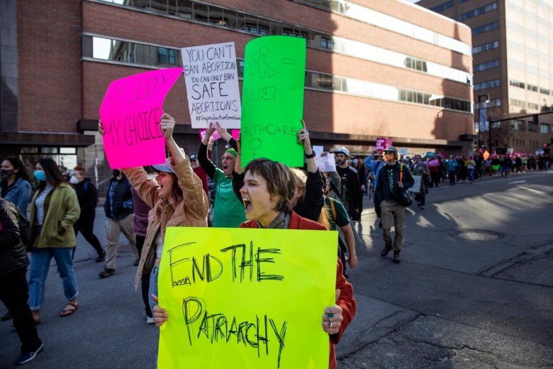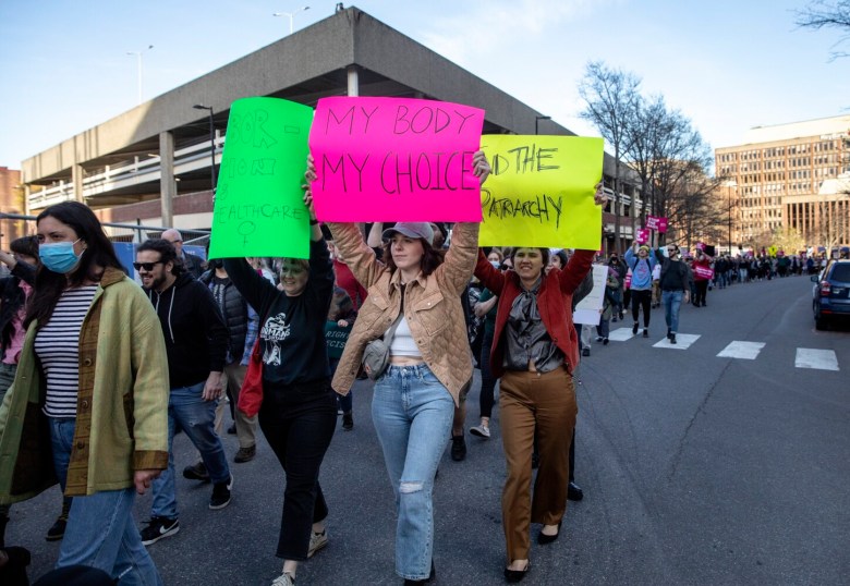 Protesters carried cardboard signs with their messages “Abortion is health care” and “Bans off our bodies” — and chanted together.