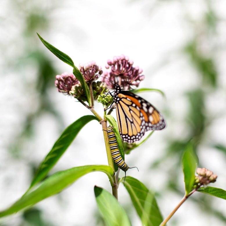 NORTH BERWICK, ME - JULY 25: Patricia Cluff has created ever expanding waystations for Monarchs at her home in North Berwick. A Monarch butterfly lands on swamp milkweed next to a Monarch caterpillar. (Staff photo by Derek Davis/Staff Photographer)