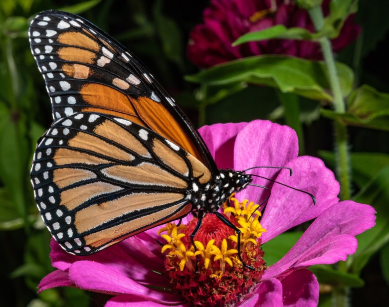 GARDINER, ME - AUGUST 9: A Monarch Butterfly extends Monday August 9, 2021 a proboscis to suck pollen from a plant on the Gardiner waterfront along the Kennebec River. Flower beds abutting the river that are cultivated by the volunteer brigade of Gardiner Gardners have become a natural magnet for bees, butterflies and hummingbirds as the plants have blossomed. Andy Molloy/Kennebec Journal