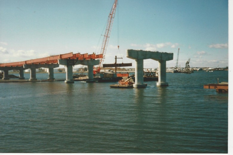 Construction of the Casco Bay Bridge began in February 1994, at the price of $130 million and 500,000-man hours of labor, according to the Maine Department of Transportation.