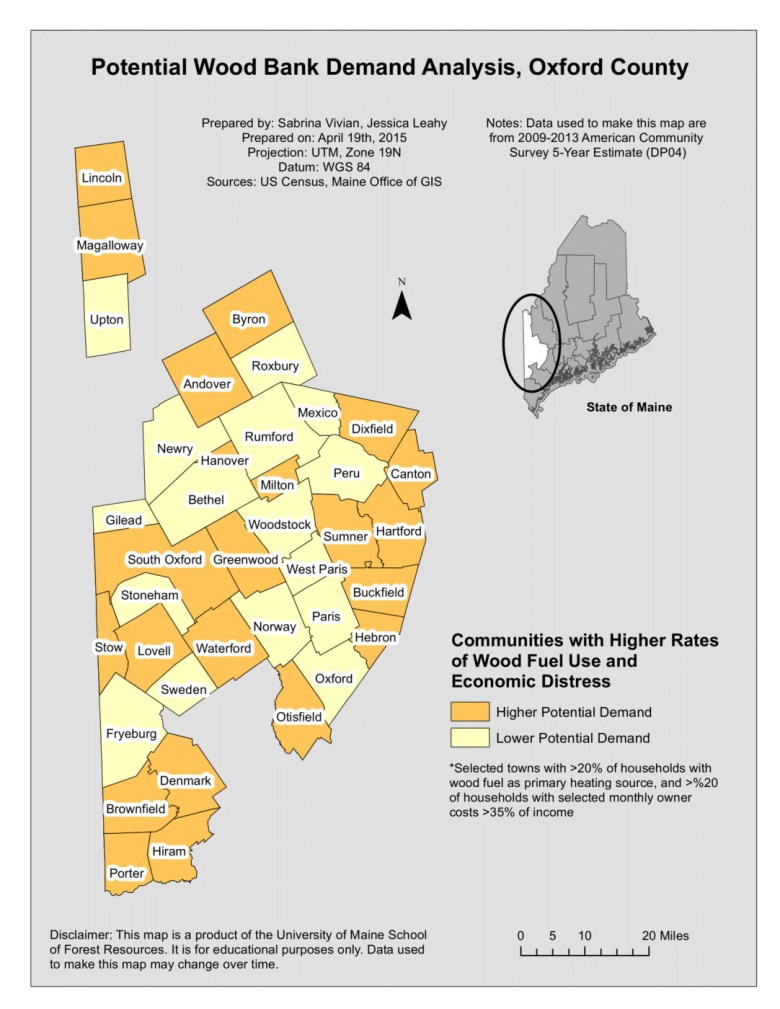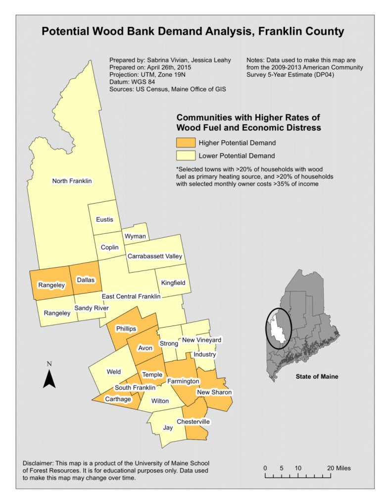 A demand analysis conducted by Vivian and Leahy in 2015 found that residents near Farmington, Rangeley, Buckfield, Canton, Stoneham and Brownfield might find wood banks to be particularly beneficial. The analysis considered income levels and the number of homes heated by wood using census data.